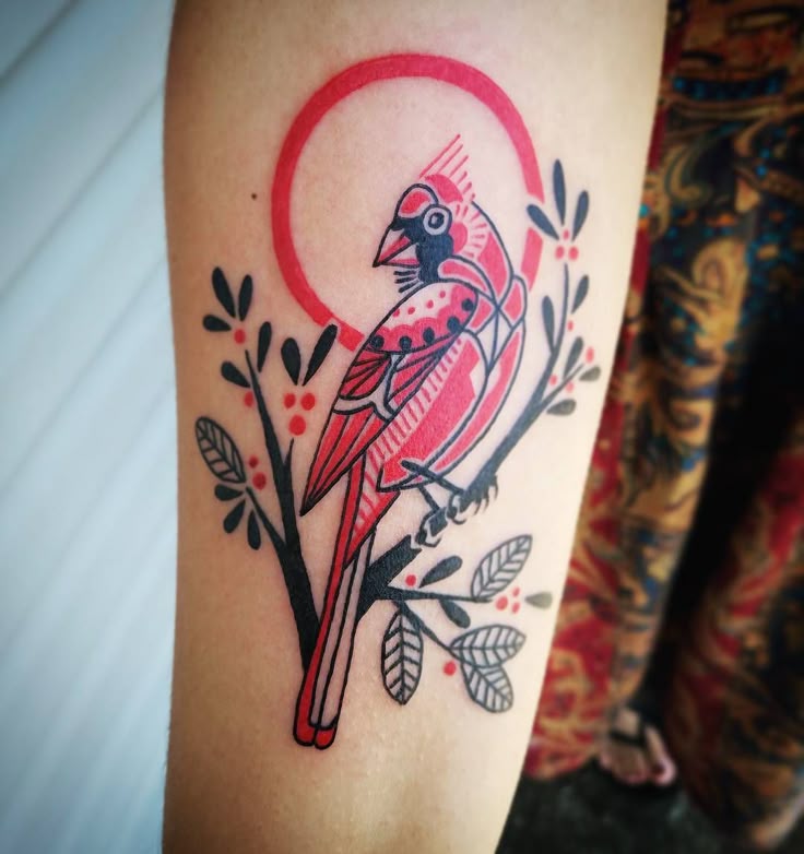 In this bold reinterpretation, the cardinal becomes a contemporary symbol of strength and passion. Building with strong geometric shapes, bright red and an edgy circle around the design made the piece surprisingly modern yet based in tradition. The abstract style attracts people who like a more creative and artistic alternative to traditional bird tattoos. Cardinals often carry connotations of life force and the presence of loved ones, making this tattoo rich in meaning.