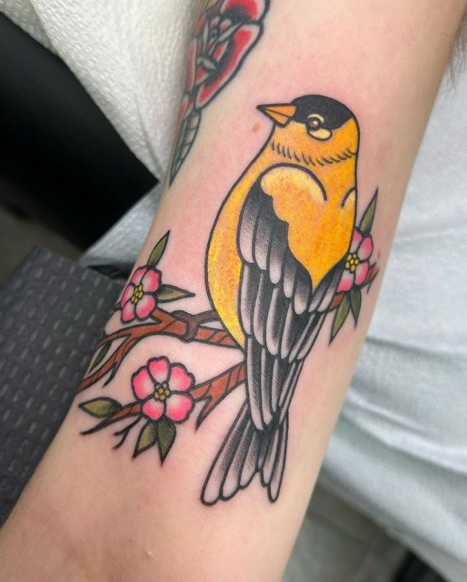Drawing from traditional American tattoo design, this vibrant yellow songbird perches gracefully among pink blossoms. Acrylics and black lines are perfectly balanced with colors, making the art really stand out. Yellow songbirds symbolize positivity, creativity, and light-heartedness. This design idea appeals to those seeking a bold statement tattoo that feels both vintage and timeless — particularly well-suited for the forearm or calf.