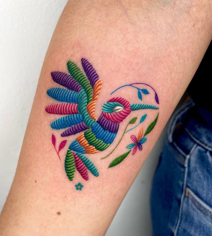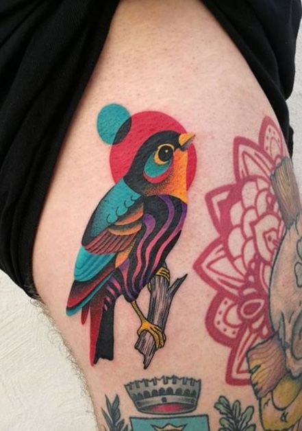 In a creative twist, this bird tattoo is designed to look like embroidered threadwork, with rich colors and detailed stitching effects. Because of its rainbow-colored feathers, the bird seems cheerful and happy. It’s a bold pick for those who love abstract and non-traditional tattoo ideas, turning the skin into a canvas for artistic expression.