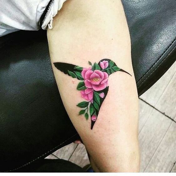 Combining nature and art, this tattoo transforms the bird’s form into a fusion of bold black silhouette and vibrant florals. The softness and femininity come from the flowers on the bird’s wings. It works well for people who want both beauty and a sense of freedom. Men and women both like the look of this style because it represents growth and energy. Its placement on the arm makes it visible yet easy to conceal if needed.