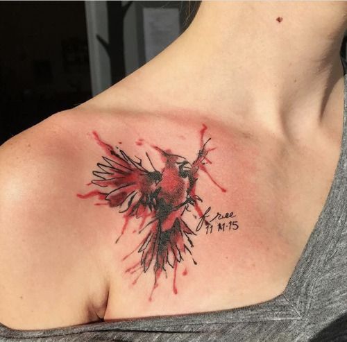 This striking cardinal tattoo uses a watercolor effect to create a sense of movement and emotion, enhanced by personalized script below. With the cardinals, this painting seems to stand for hope, freedom and a brightly passionate feeling. This is a great choice for a back or chest tattoo, since it moves and changes with your body. The addition of custom dates or words makes it deeply personal — a common request among those looking for tattoos with significant meaning.