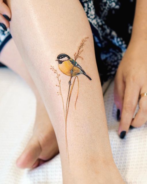 For lovers of minimalist tattoos, this design features a small bird perched delicately on a reed. Because of the soft colors and detailed lines, it feels calming and slightly poetic. It’s a perfect option for a wrist or lower leg, blending artistry with a touch of quiet symbolism about patience and observation.
