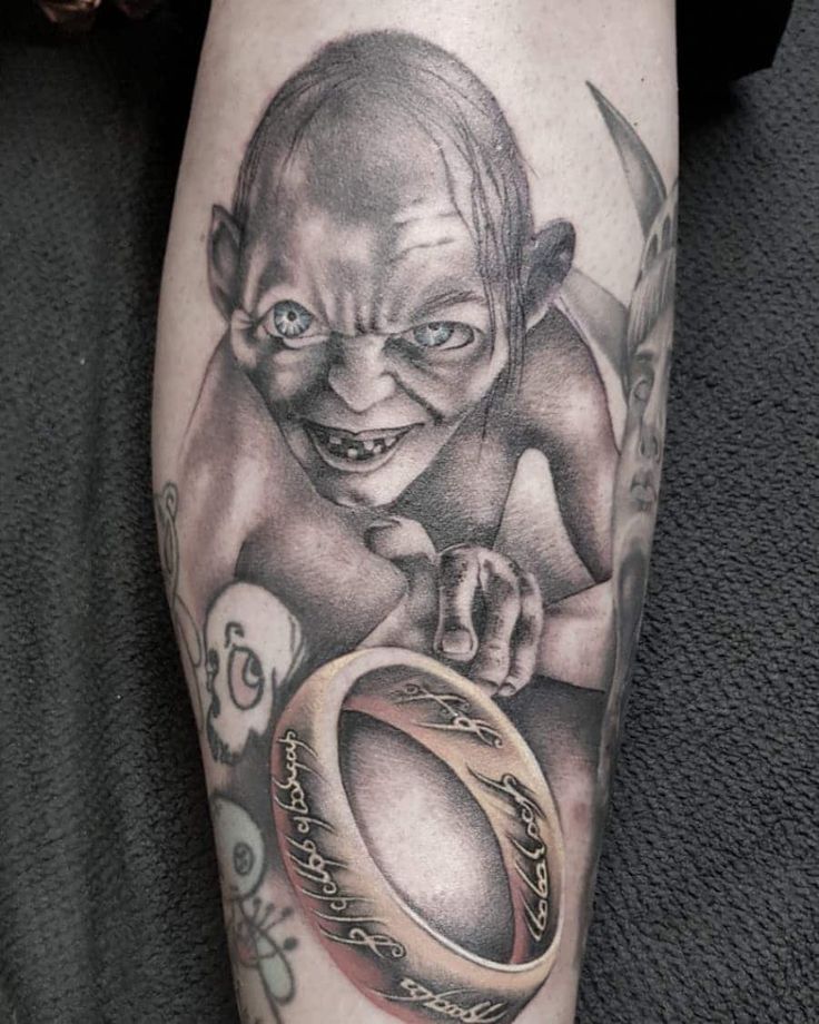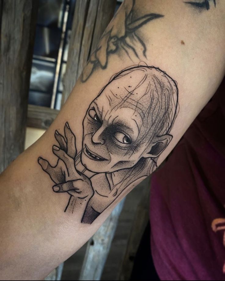 Here, Gollum is depicted with haunting realism — wide, hollow eyes, bony fingers, and a gaunt face that captures his lifelong struggle with the One Ring. The artist uses fine lines and detailed shading to underline how Gollum has changed from Sméagol to Smigel the corrupted being. It demonstrates the artist’s skill as well as representing the risks that come with greed and obsession. Ideal for designs for men who appreciate the complex, darker corners of Tolkien’s universe, this piece turns Gollum’s tragedy into captivating body art.