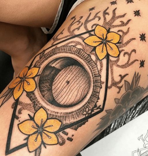 Merging classic art with Tolkien mythology, this tattoo recreates a design drawing inspired by Michelangelo’s Creation of Adam. The regular hand represents Gandalf the Grey and the other, a skeletal armored hand, is Sauron, wearing the ring. The art is surrounded by Elvish script which makes the piece feel genuine using elvish sayings. The extremes in color of her hands suggest the constant clash between good and evil. It’s a compelling design for men and women who want a deeply meaningful piece.