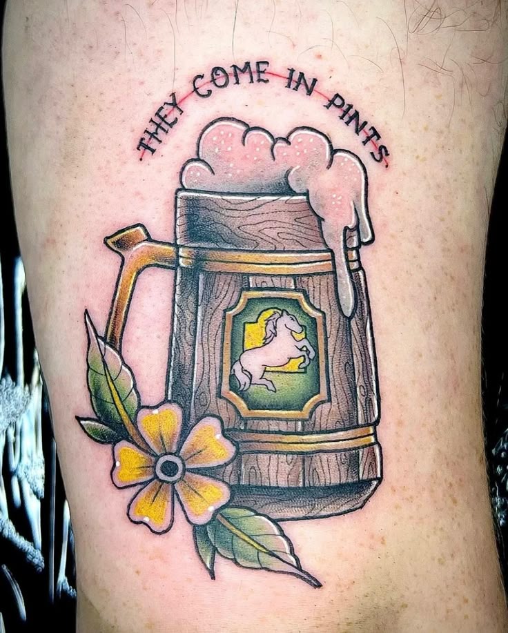 Few lines in the series evoke as much lighthearted joy as “They come in pints!” The design pictures a bursting mug of ale that shows the happy moment, surrounded by beautiful flowers and hinting at the wooden buildings found in Hobbiton. Because of its friendly look, this design is an excellent choice for anyone who wants a tattoo that stands out and spreads smiles. The bright palette and solid outlines give it a timeless tattoo parlor vibe while paying tribute to the carefree spirit of hobbits and their love for good drink and good company.