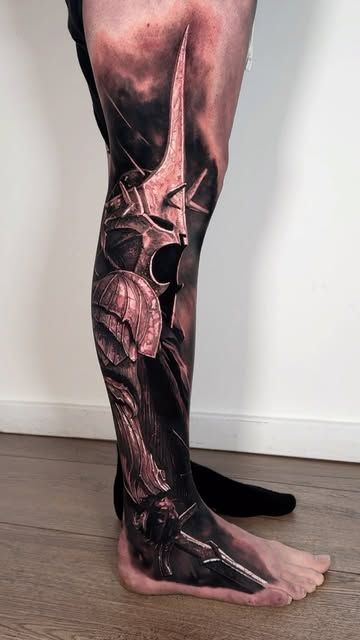 Taking body art to an entirely different level, this full sleeve leg tattoo showcases the towering figure of Sauron in his spiked armor, holding his blade with chilling authority. He makes the scene more looming by playing with very dark tones and areas of heavy contrast, making the leg almost represent the spreading of evil in Middle-earth. Perfect for ideas for men who want to embrace the villainous grandeur of Tolkien’s mythos, this sleeve embodies the looming threat of the Dark Lord in all his power — a masterclass in cinematic tattoo storytelling.