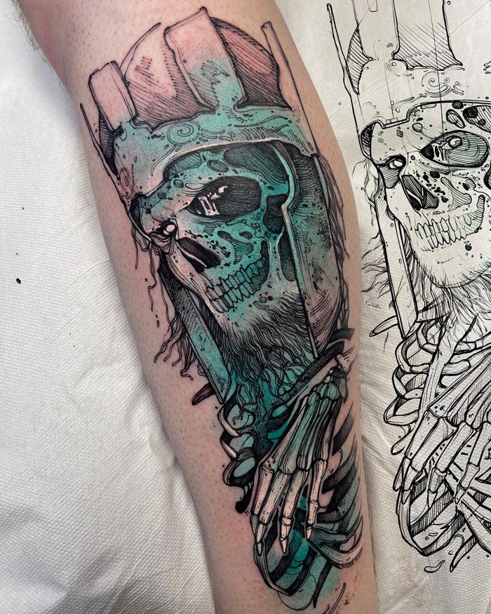 This haunting skeletal portrait of the King of the Dead perfectly channels Tolkien’s darker legends. The combination of blue and black lights gives it a spooky glow and the sculpt of the dead knight is convincingly eerie. Because the piece unites horror and fantasy, it works perfectly for fans of the mighty Rohan and the mystical lands of the Dead. For anyone seeking unique designs that stray from typical character portraits, this tattoo offers a spine-chilling yet captivating take on Middle-earth’s ghostly kings.